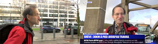 經(jīng)過諸多媒體的報道后,就有記者找到阿蘭·馮特諾,經(jīng)采訪得知他家住伊夫林省拉韋里耶爾鎮(zhèn)。在公交系統(tǒng)罷工已經(jīng)持續(xù)多日的情況下,與很多大巴黎地區(qū)的居民一樣,他下班返家面臨極大困難。上班時,他通常每天早上6點半開始以分時段的方式工作,有時下班時間是晚上8點。罷工開始后,他與公司協(xié)商后將上班時間提前至早上6時,這樣他每天就可以從家中乘坐一趟夜班車進(jìn)城。至于下班后通勤就變得異常棘手了。而他只有兩種選擇,第一種就是步行至巴黎蒙巴納斯火車站乘坐遠(yuǎn)郊鐵路N線或U線。但罷工期間,這些線路只在下午4點半后才開始恢復(fù)運行;而第二種選擇就是全程步行回家,距離是30公里。徒步需然后先后穿行圣西爾、圣康丹、特拉普等市鎮(zhèn),然后才回到拉韋里耶爾鎮(zhèn)的家中。